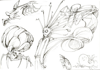 In the meantime, whenever I hit a minor... very minor... mile... okay, centimeterstone in my work I scribble around on monsterstuff. I need the distraction to keep my lines in order for the diploma. So, among some "this is what i am wearing today" and gadgets for the monsterbook, here are the rough drawings of some monsters - all pages from my current sketchbooks.